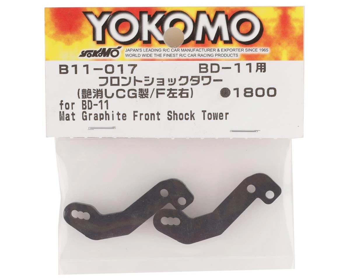 Yokomo BD11 Graphite Front Shock Towers. This replacement front shock tower set is intended for the Yokomo BD11. Package includes two front shock tower halves.
